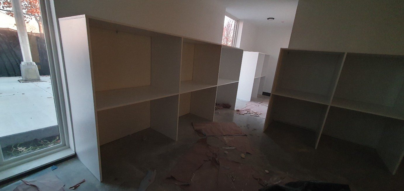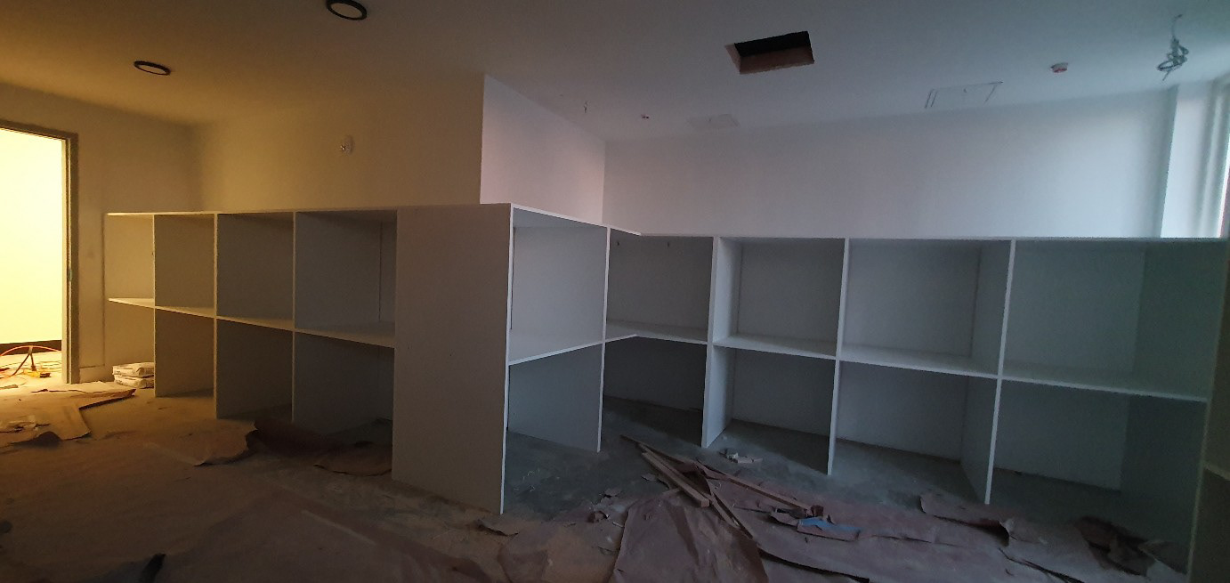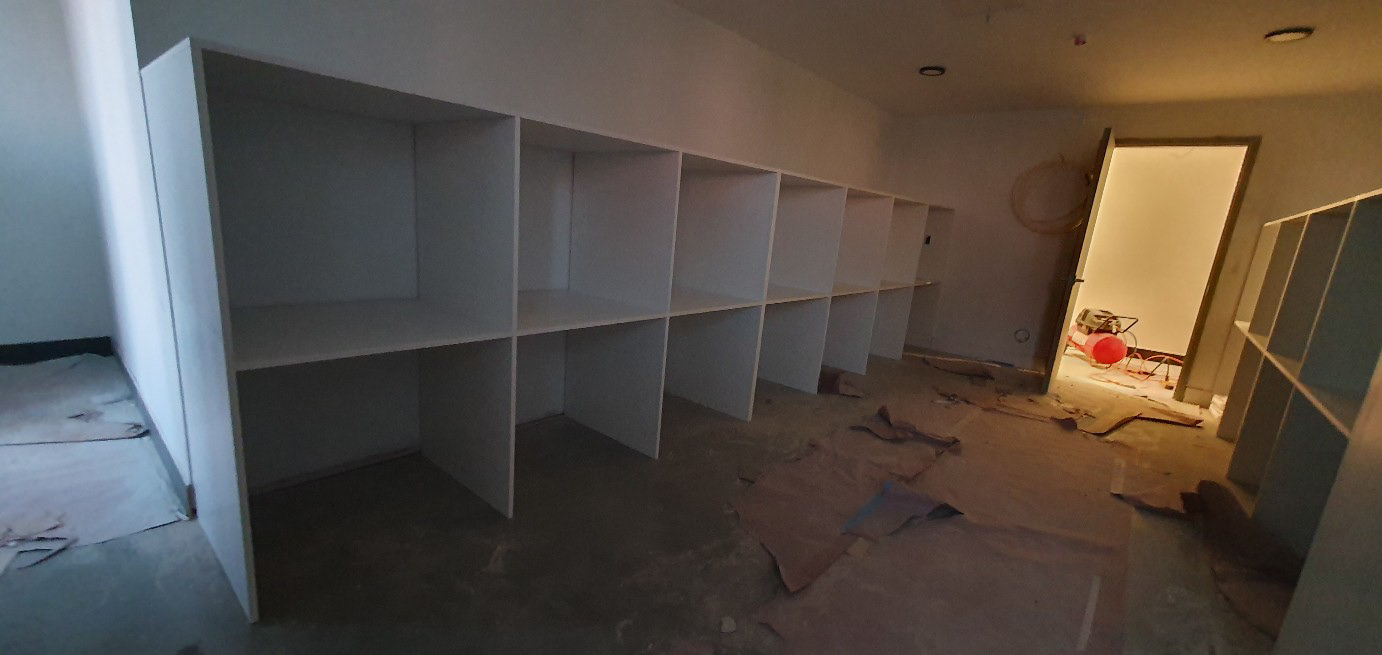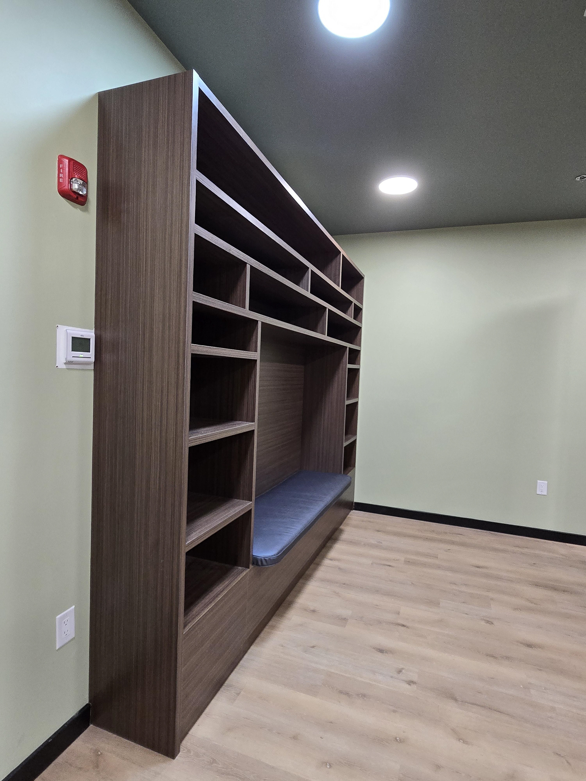 Cabinets on lobby, package room, rest area. Arch interior mill work. Located in Newark, NJ.