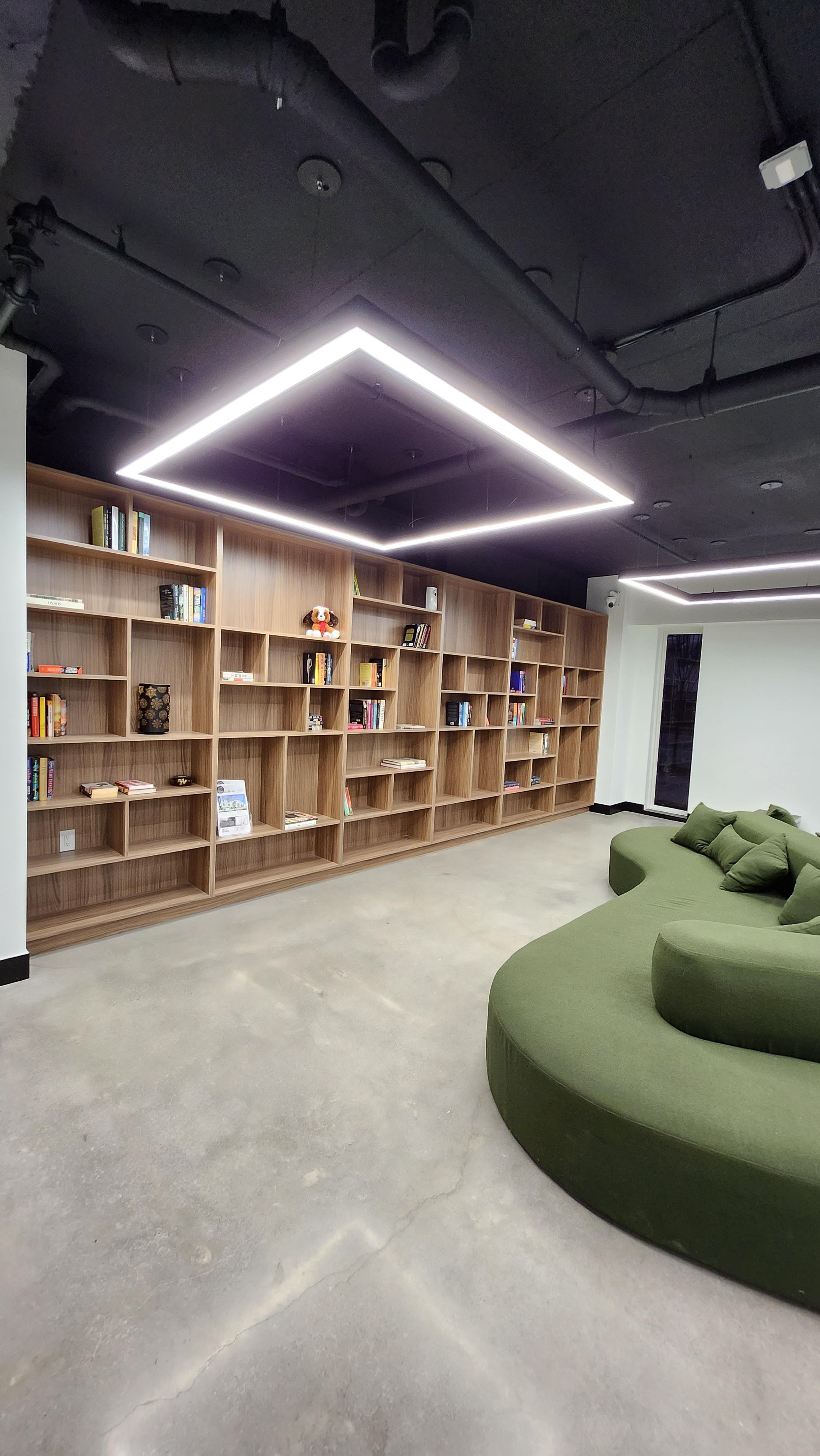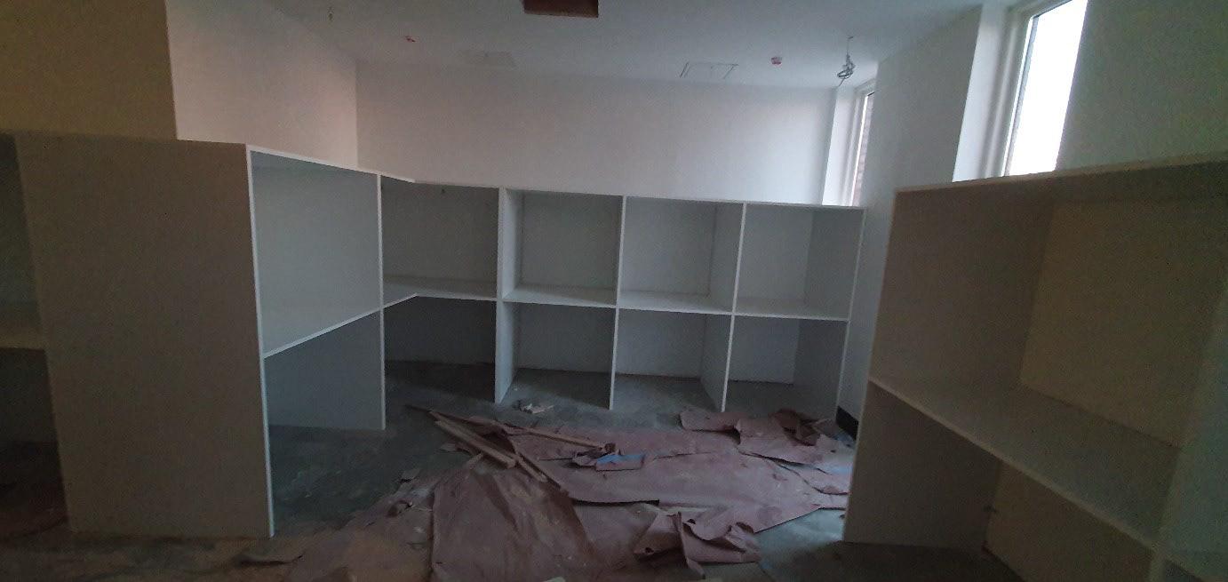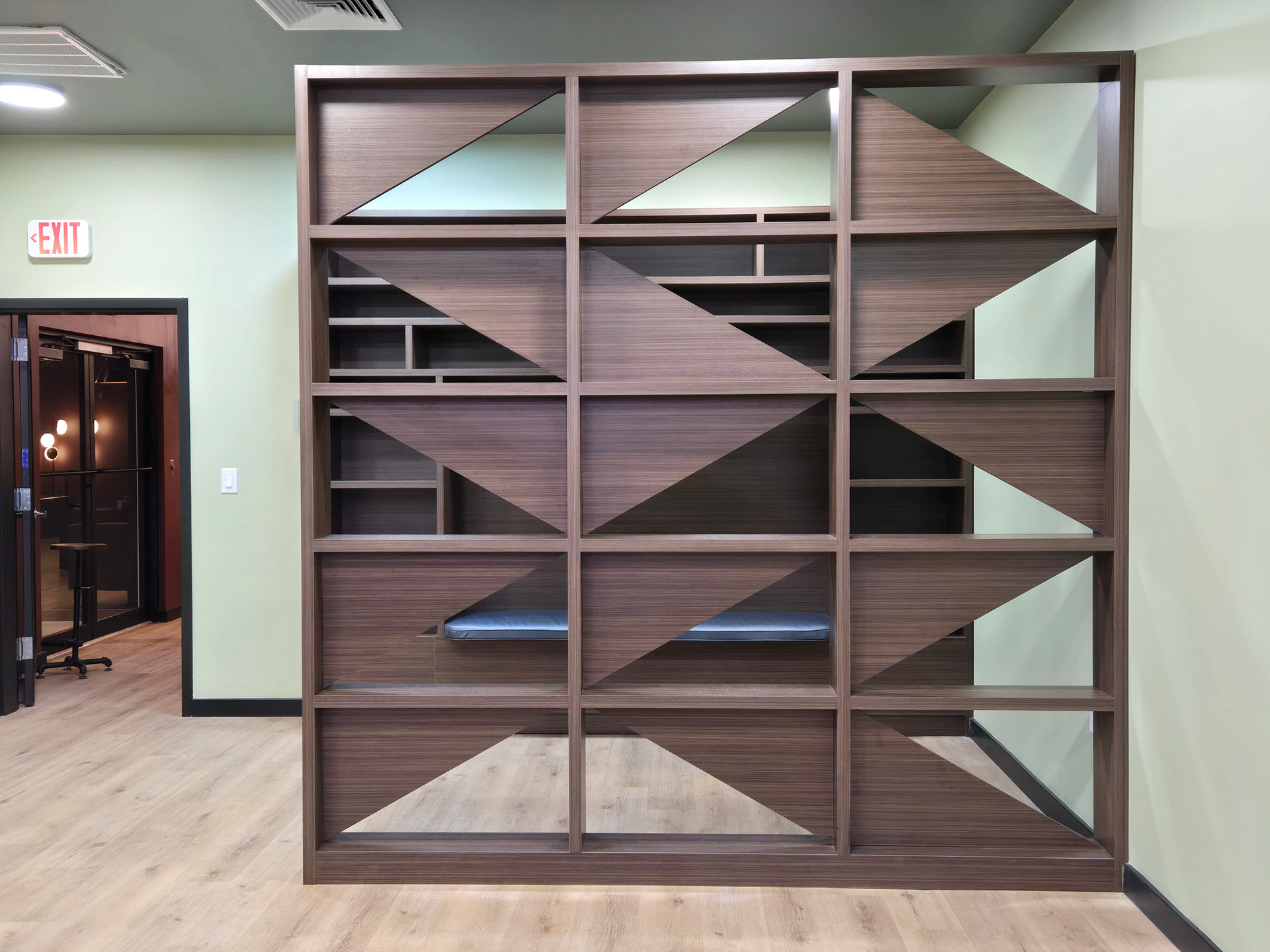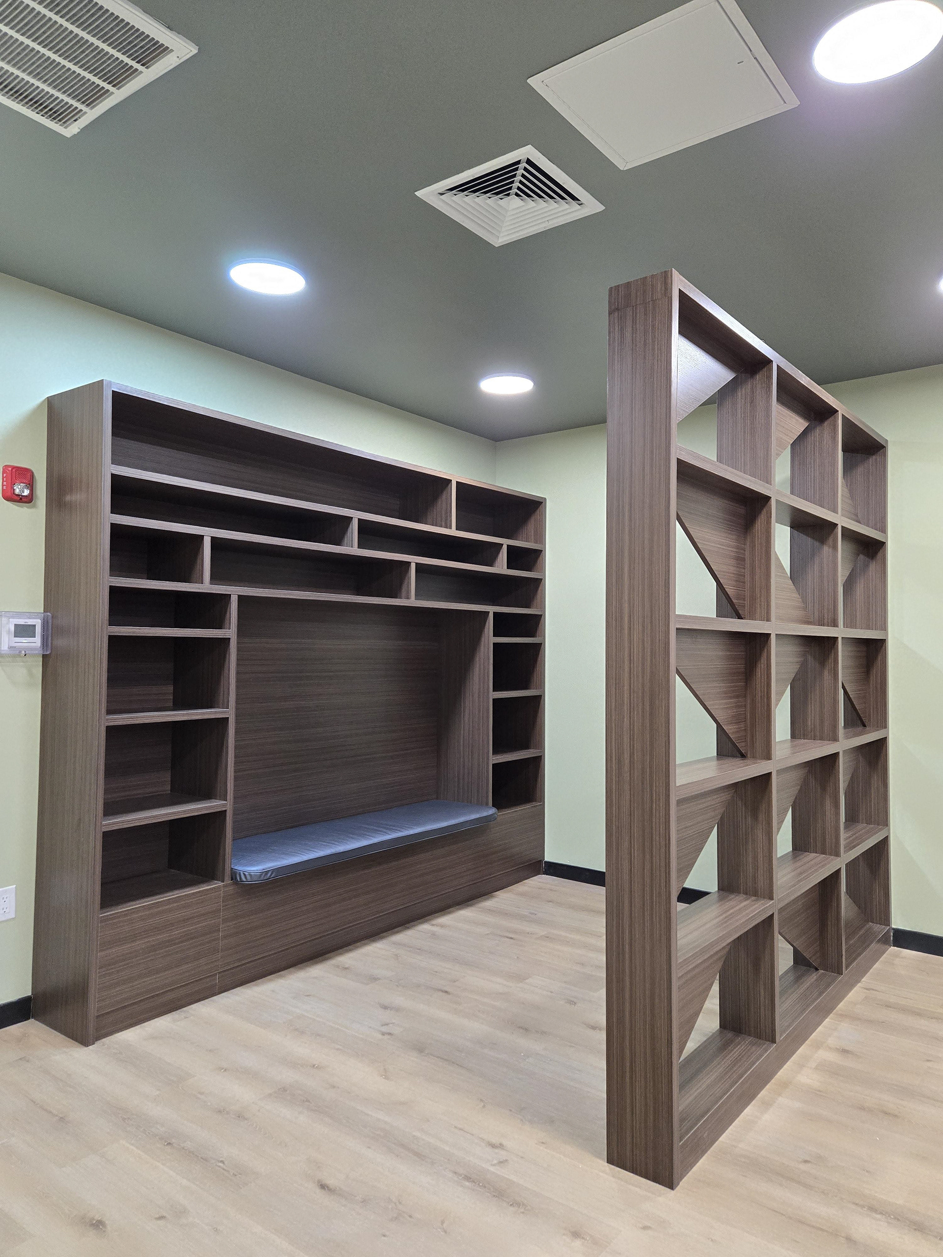 Cabinets on lobby, package room, rest area. Arch interior mill work. Located in Newark, NJ.