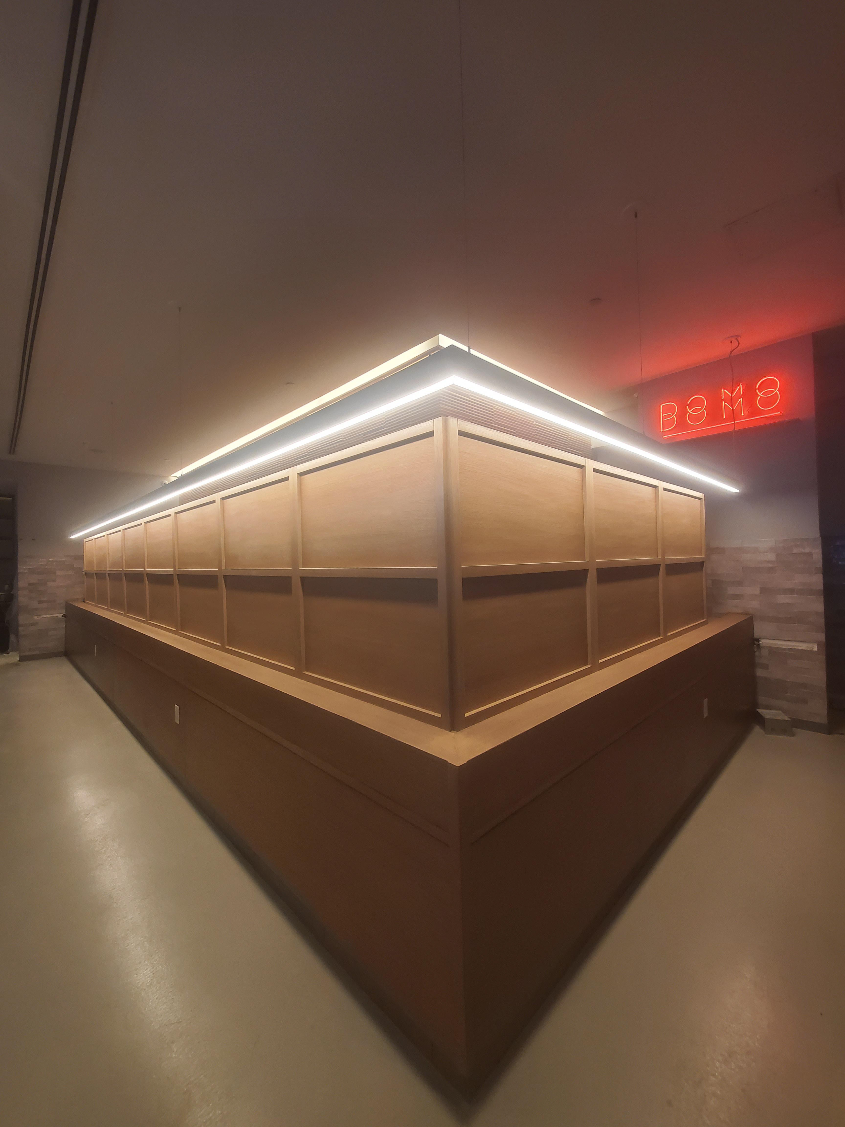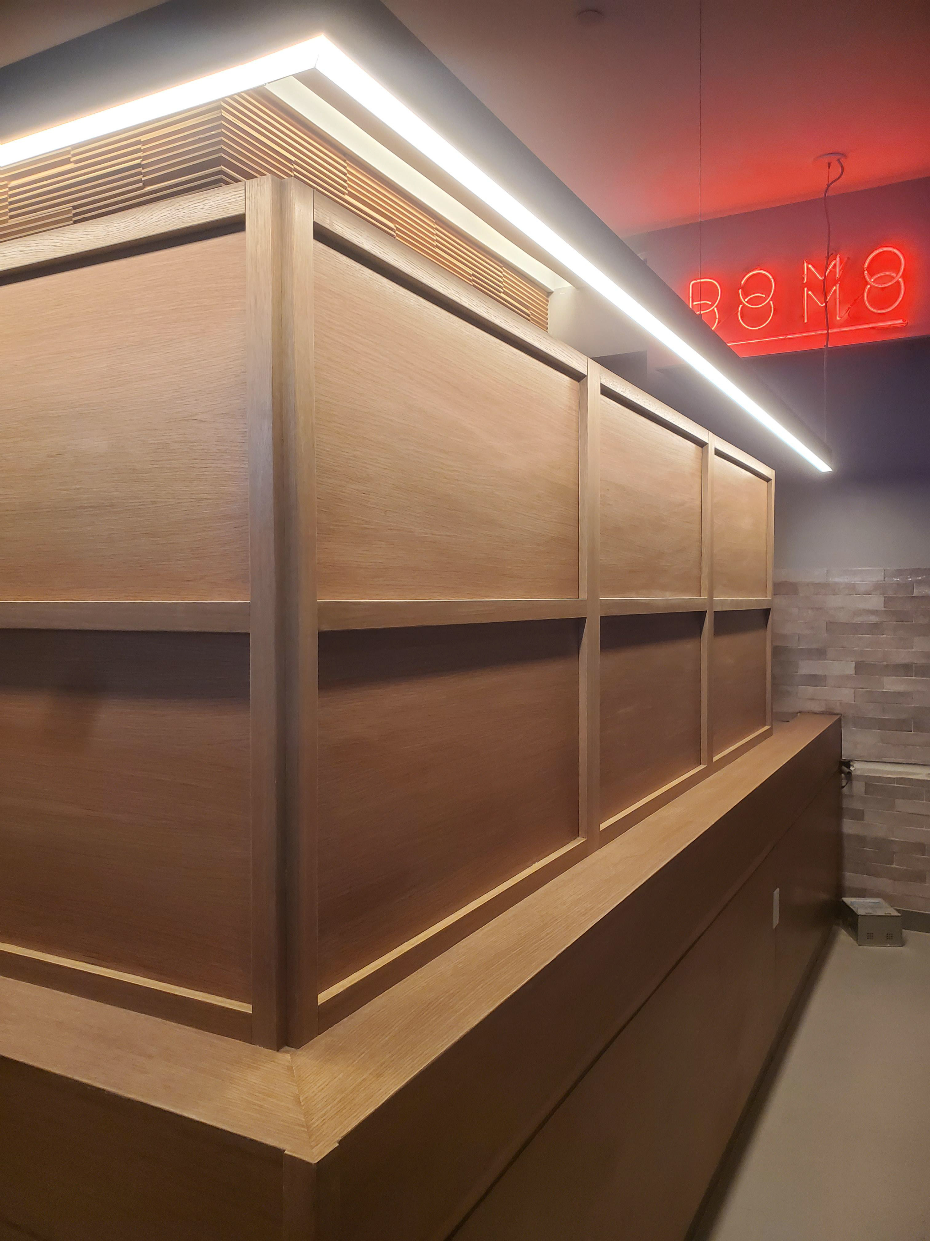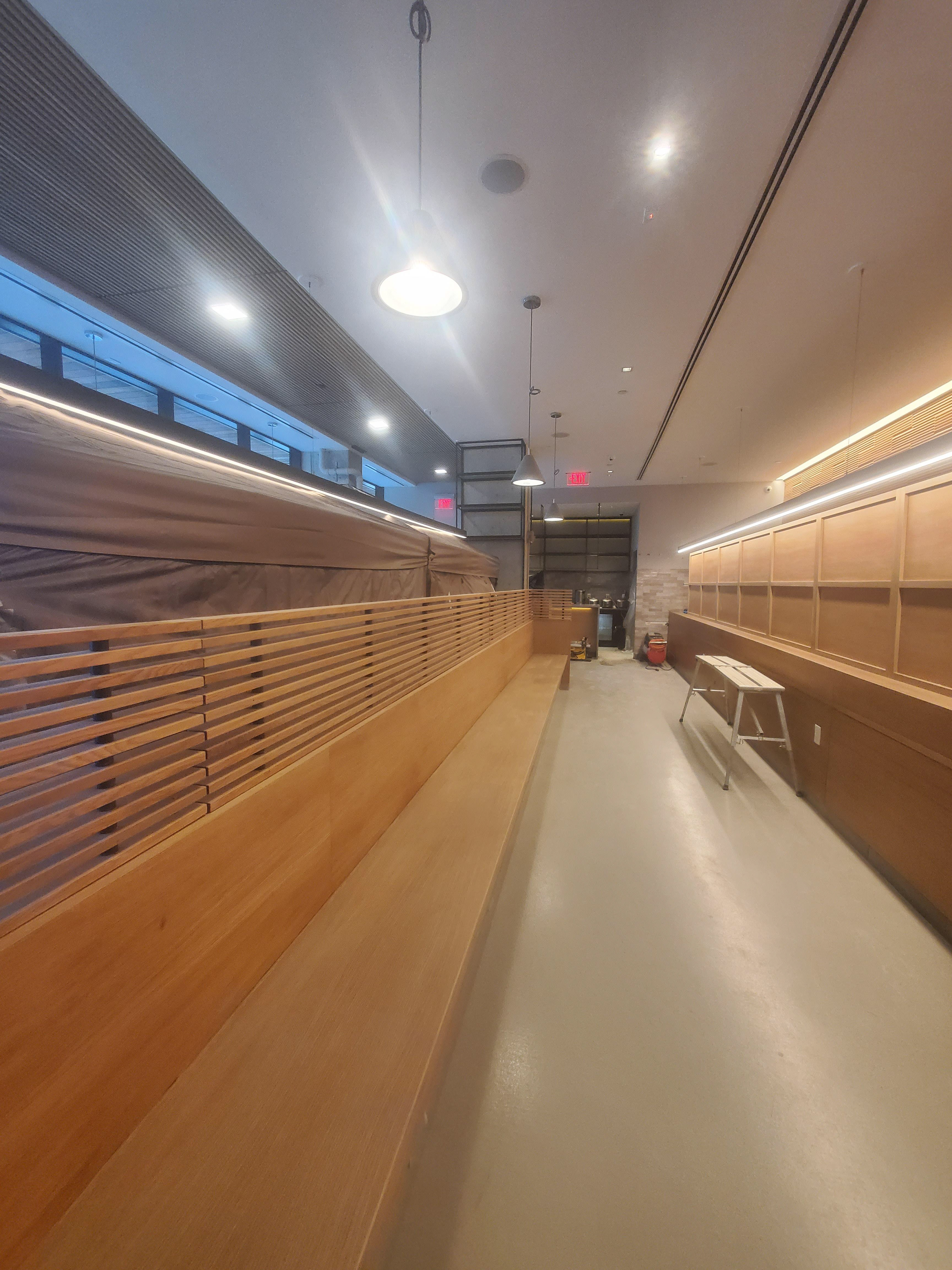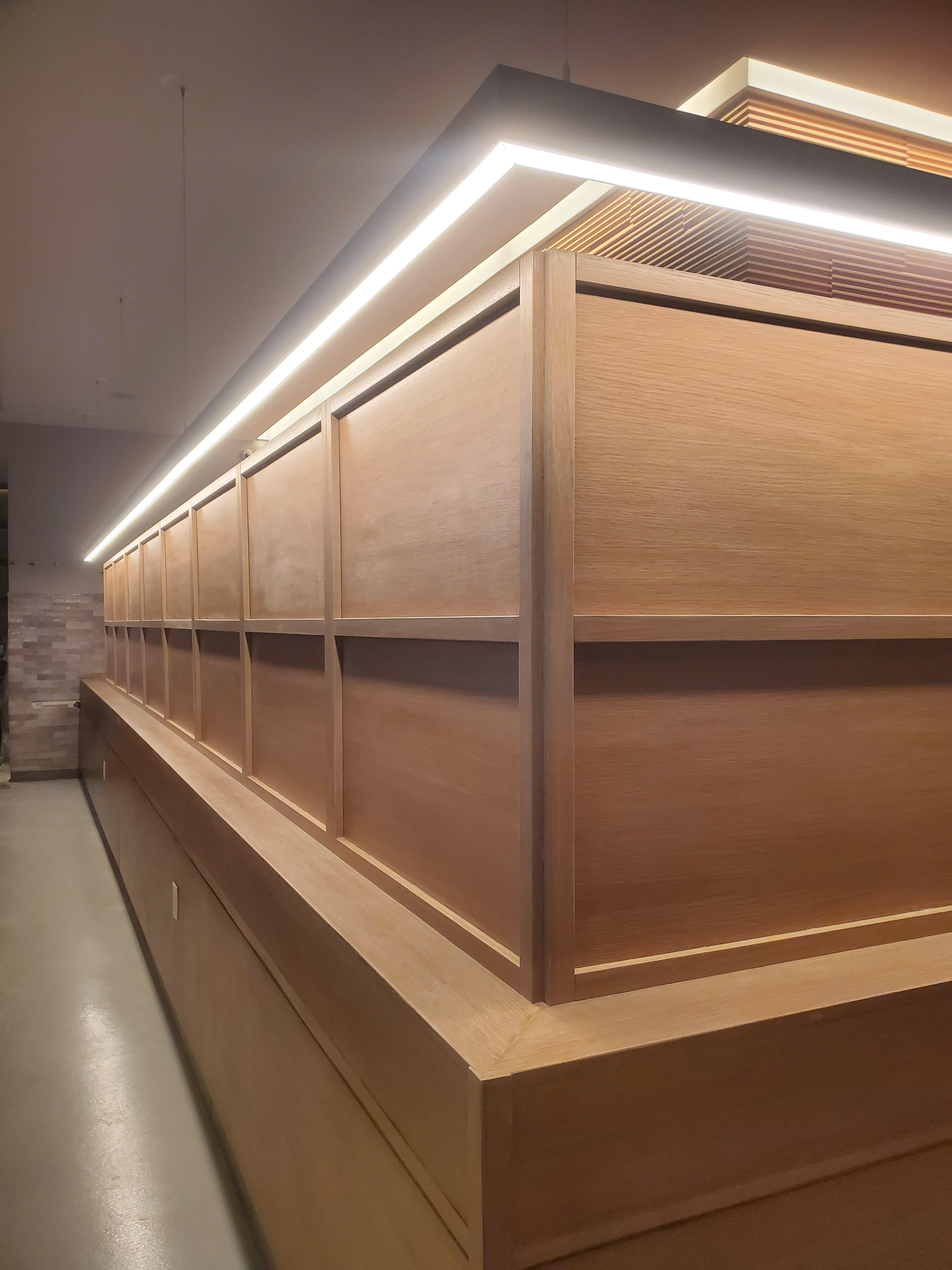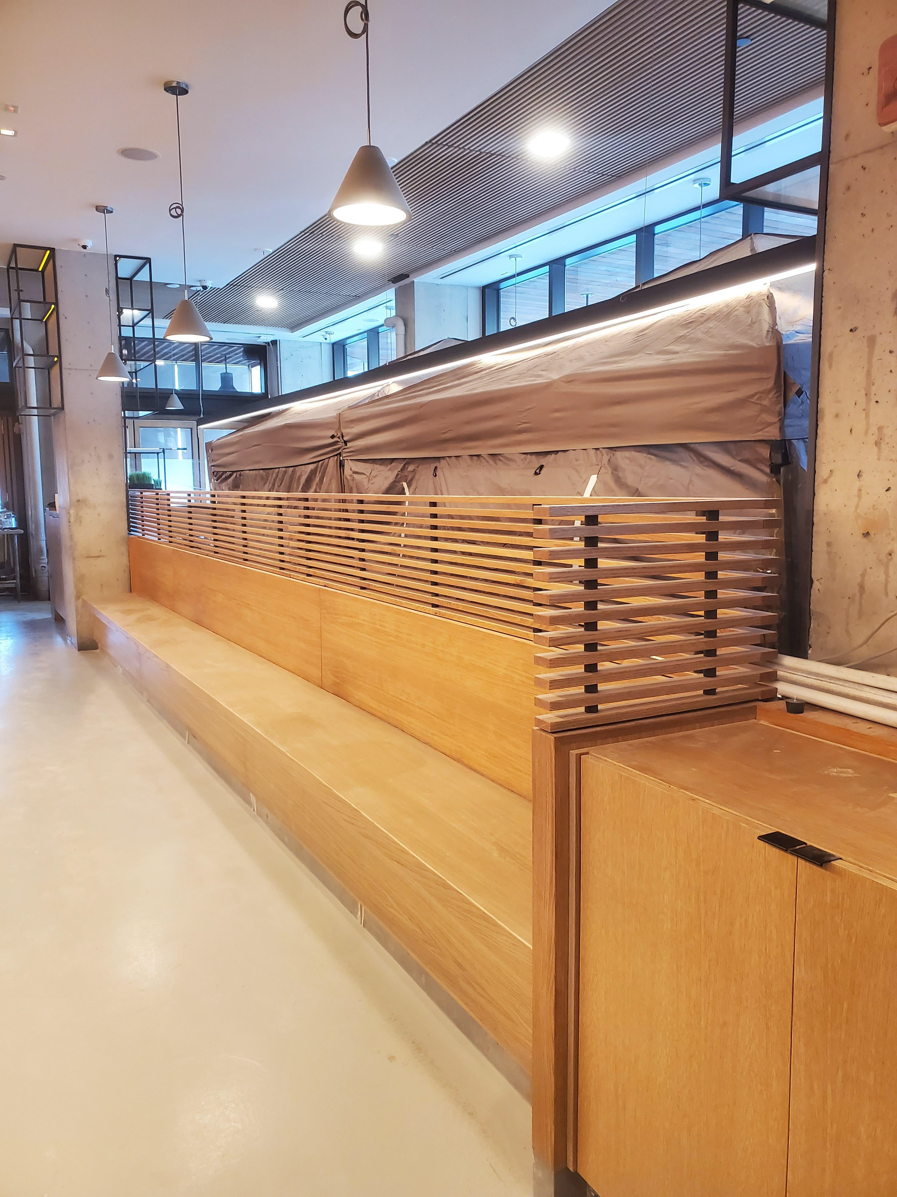 Screen between Dining and Kitchen, Banquette, Custom Cabinet