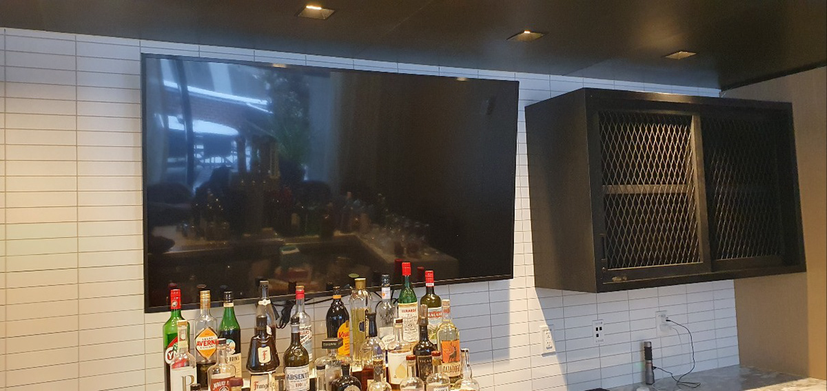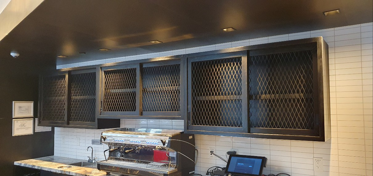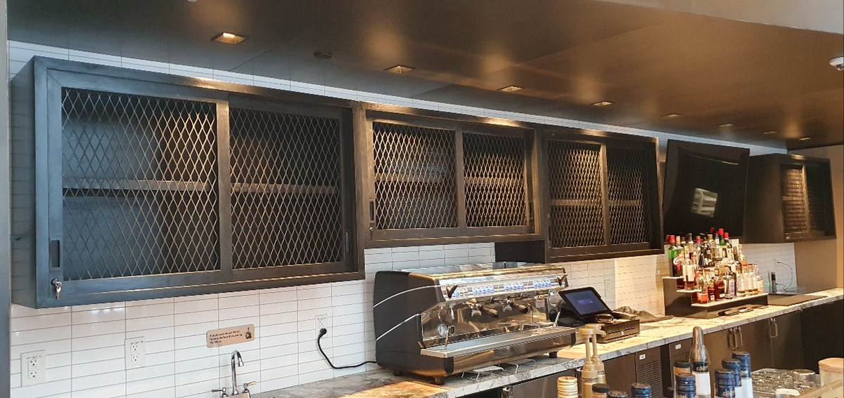 Custom bar cabinet with extended metal door. Located in Jersey City, NJ Before & After