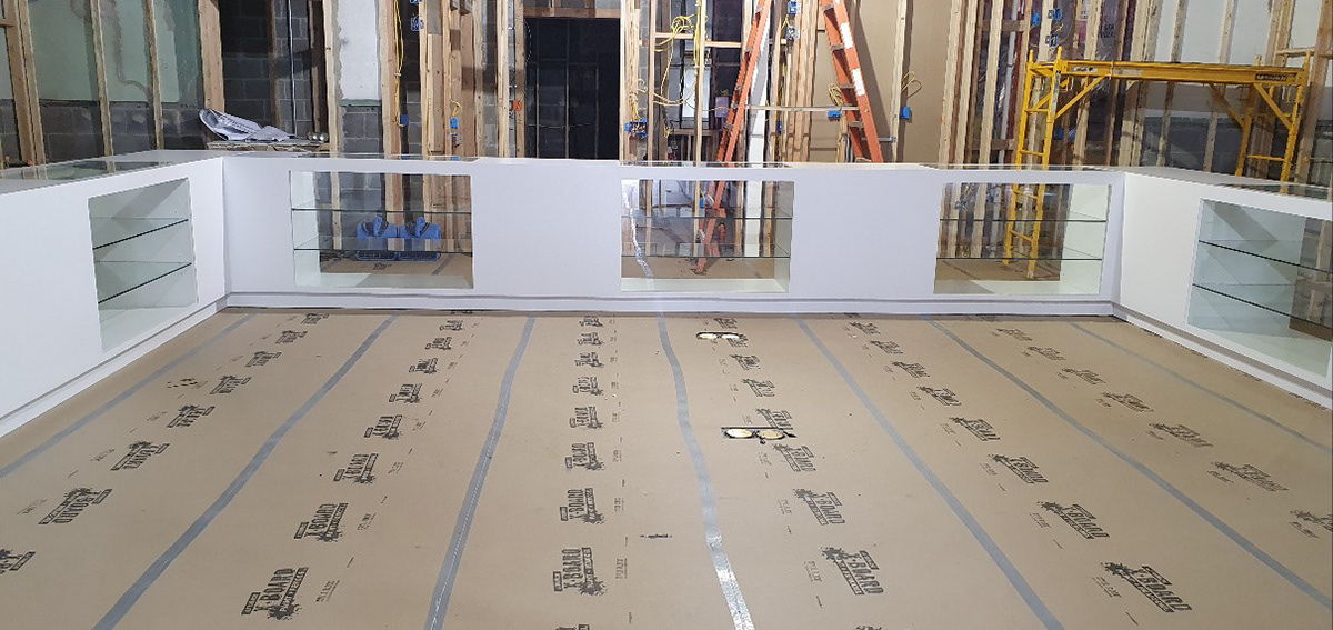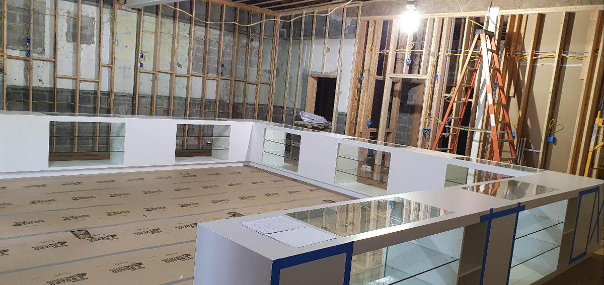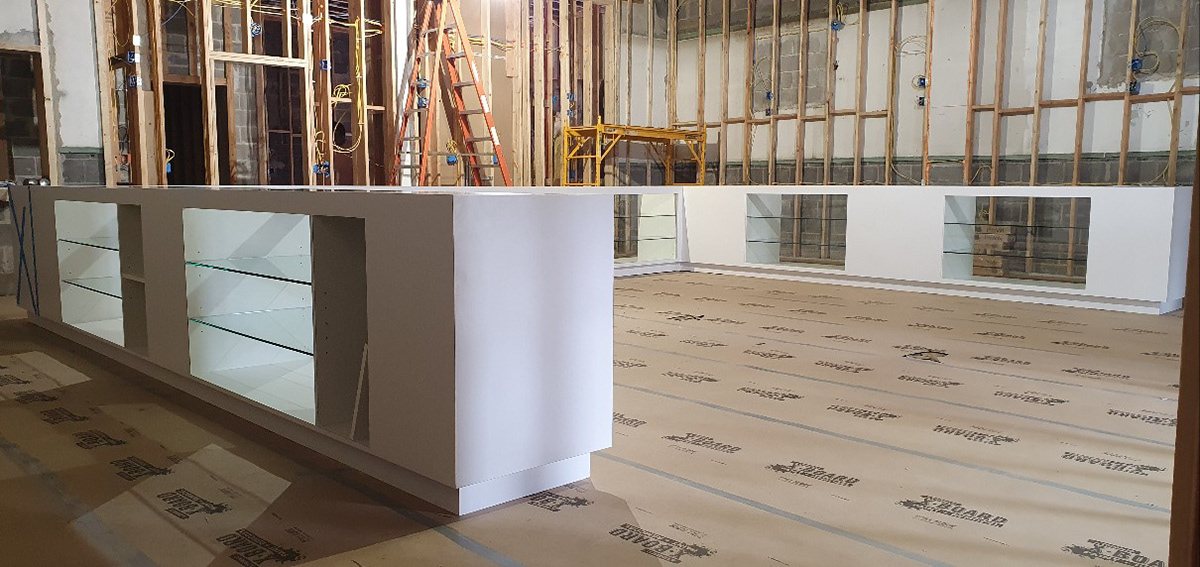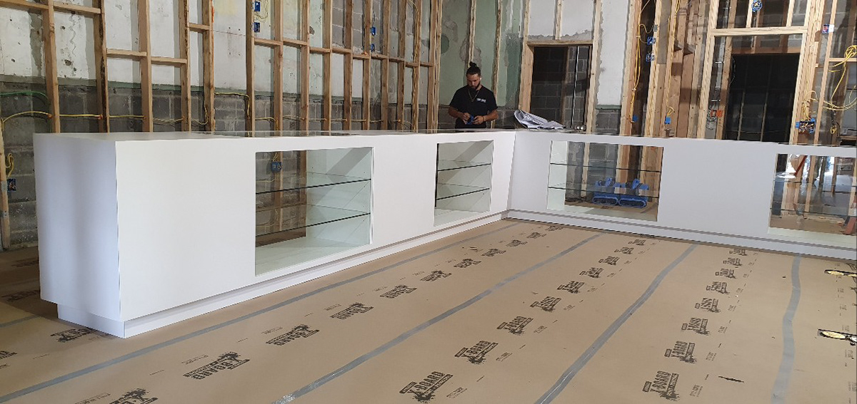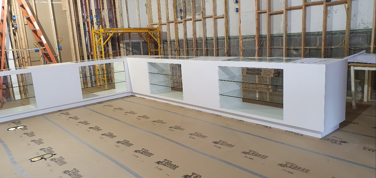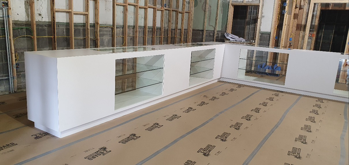 Custom built-in cabinets/ countertop with glass top/ shelves. Located in Red bank, NJ.